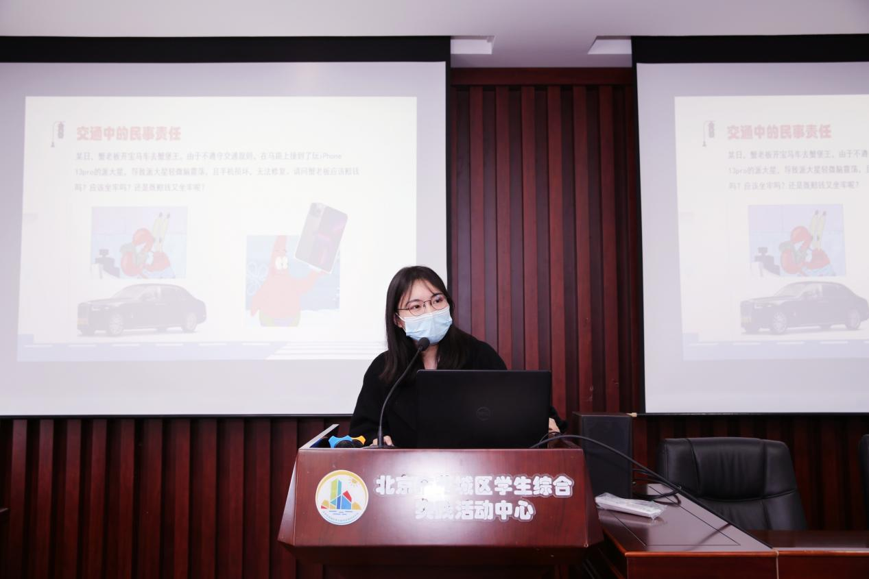在第二部分,王鄭嫻同學通過一些生動有趣的案例,從民事責任、行政責任、刑事責任三個層次依次遞進向小朋友解讀了違反交規(guī)法律的行為需要承擔哪些法律責任,將法律知識講解的深入淺出,淺顯易懂,小朋友們參與互動非常熱情積極。
