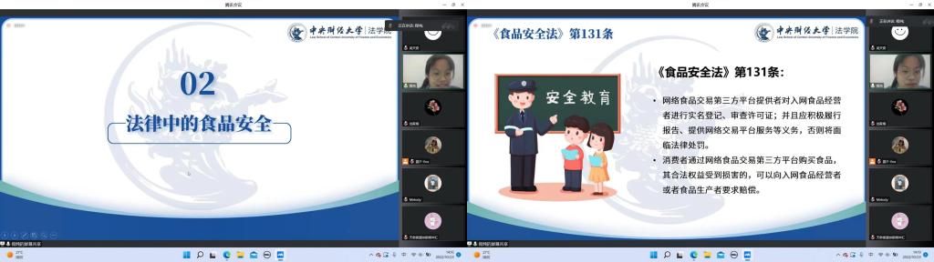 為更好地開展“科普食品安全知識(shí)及食品安全法”主題普法宣傳活動(dòng),讓《食品安全法》走進(jìn)每一個(gè)群眾的日常生活當(dāng)中,更好地讓人民群眾運(yùn)用法律武器維護(hù)自己的食品安全,10月23日下午14:00,由中央財(cái)經(jīng)大學(xué)法律援助協(xié)會(huì)負(fù)責(zé)人周雨欣帶隊(duì),成員柴琳、程純主講,攜手成員陶笑然、吳天奇,共同參與了由北京市西城區(qū)天橋社區(qū)青年匯主辦,晨夕法律服務(wù)中心協(xié)辦的直播普法活動(dòng),為20名天橋小區(qū)的青年帶來了“食以安為先——食品安全普法宣講”主題普法宣講活動(dòng)。