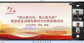 2022年10月23日,協(xié)會(huì)為北京市西城區(qū)天橋社區(qū)開展“食以安為先——食品安全普法宣講”活動(dòng)。協(xié)會(huì)成員闡述了食品安全是什么以及我國(guó)的食品安全標(biāo)識(shí),接著為大家介紹了“315晚會(huì)”及其曝光的典型食品安全案件,其中詳細(xì)說明了“三鹿奶粉案件”和“老壇酸菜案件”,最后向居民們普及了食品安全小常識(shí)與3個(gè)食品安全相關(guān)的投訴舉報(bào)電話,回應(yīng)了廣大居民關(guān)心的食品安全問題。
