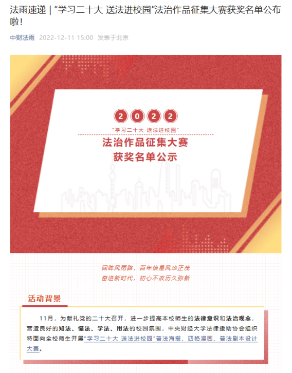 2022年11月,協(xié)會(huì)面向全校師生開展“學(xué)習(xí)二十大 送法進(jìn)校園”普法海報(bào)、四格漫畫、普法劇本設(shè)計(jì)大賽,在校同學(xué)積極投稿參與。
