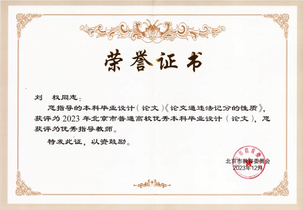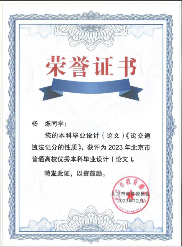 近日,北京市教育委員會公布了2023年北京市普通高等學校優(yōu)秀本科生畢業(yè)設(shè)計(論文)評選結(jié)果(京教函〔2023〕529號),我校共計23篇本科生畢業(yè)設(shè)計(論文)入選。其中,我院2019級本科生楊爍同學的《論交通違法記分的性質(zhì)》獲評“2023年北京市普通高校優(yōu)秀本科畢業(yè)論文”,劉權(quán)教授獲評“2023年北京市普通高校優(yōu)秀本科畢業(yè)設(shè)計(論文)優(yōu)秀指導教師”。