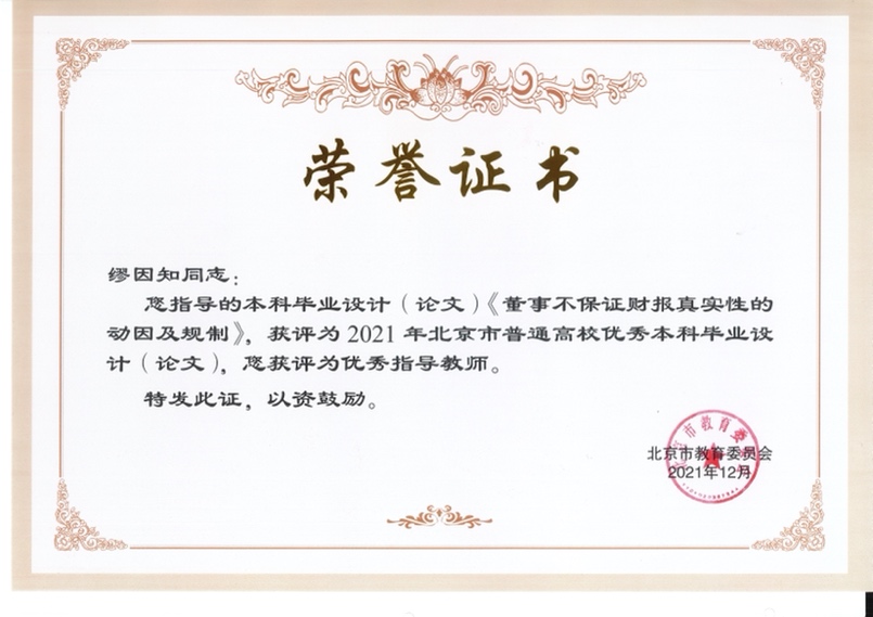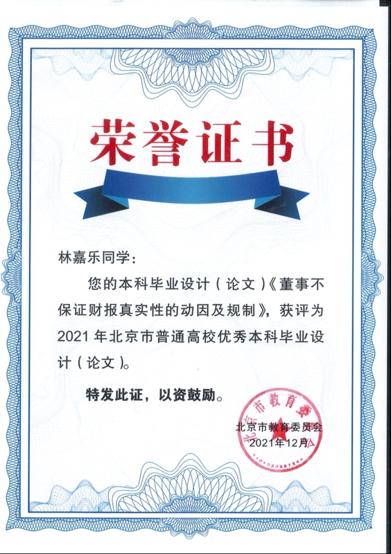 近日,北京市教育委員會(huì)公布《北京市教育委員會(huì)關(guān)于公布2021年北京市普通高等學(xué)校優(yōu)秀本科生畢業(yè)設(shè)計(jì)(論文)名單的通知》(京教函〔2021〕638號(hào)),中央財(cái)經(jīng)大學(xué)共計(jì)22篇入選,其中,我院2017級(jí)本科生林嘉樂同學(xué)的《董事不保證財(cái)報(bào)真實(shí)性的動(dòng)因及規(guī)制》獲評(píng)“2021年北京市普通高校優(yōu)秀本科畢業(yè)論文”,同時(shí),繆因知教授獲評(píng)“2021年北京市普通高校優(yōu)秀本科畢業(yè)設(shè)計(jì)(論文)優(yōu)秀指導(dǎo)教師”。