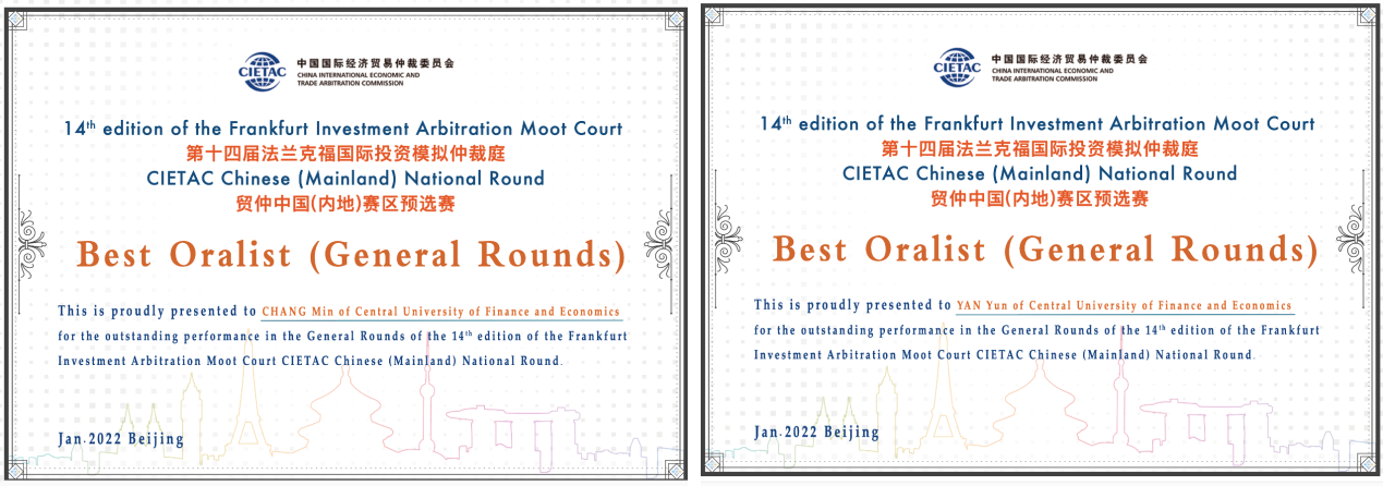 經(jīng)過此次比賽的歷練,我院參賽隊員們極大地拓寬了自己的專業(yè)視野,鍛煉了邏輯思維能力、口頭表達(dá)能力及資料檢索能力,為我院今后的投資仲裁模擬法庭比賽打下了良好的基礎(chǔ),積累了寶貴的經(jīng)驗。祝愿中央財經(jīng)大學(xué)代表隊在未來的比賽中再接再厲,取得更加優(yōu)異成績。